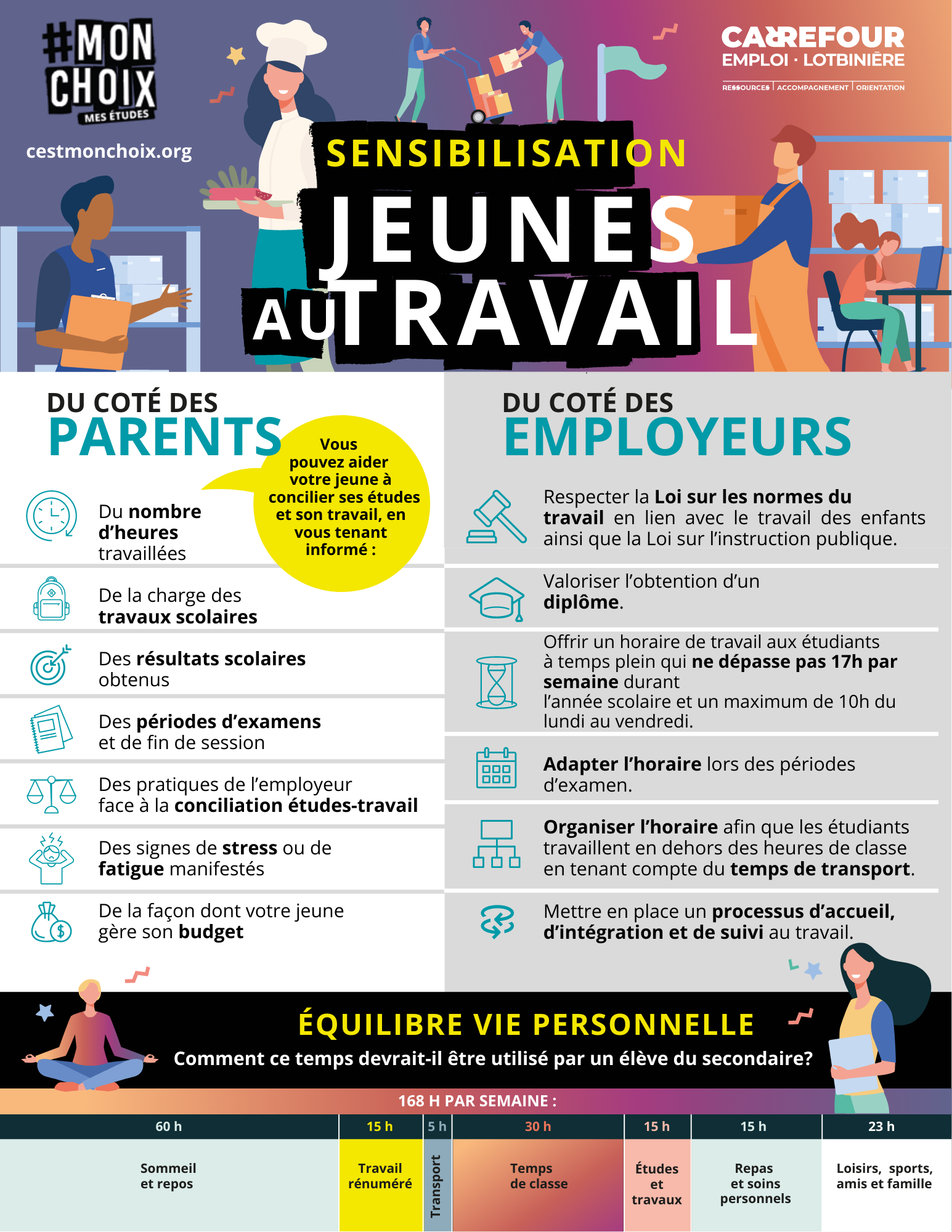 Ton premier travail, c’est d’être un élève. Mais si tu veux aussi travailler, c’est possible, à condition de respecter tes limites et celles fixées par la loi. Depuis septembre 2023, une loi est là pour t’aider à trouver le bon équilibre entre études et travail. Tout d’abord, savais-tu qu’au Québec, l’âge minimal légal pour travailler est de 14 ans ? Les jeunes de moins de 14 ans peuvent travailler dans certains emplois seulement. Pour en savoir plus sur les emplois pour les moins de 14 ans : c’est ici!