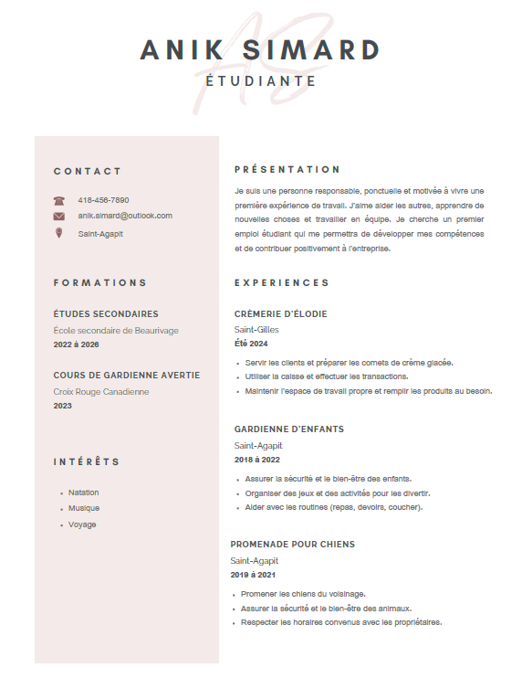 Par exemple : Anick Simard : Élève de 14 ans motivée et responsable, je cherche ma première expérience de travail. J’aime apprendre, aider les autres et travailler en équipe.