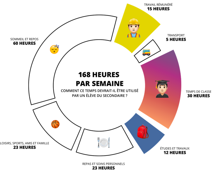 La conciliation entre les études et le travail consiste à trouver un juste équilibre entre le temps que tu consacres à ton emploi et celui que tu dédies aux études pendant l’année scolaire. L’objectif est que tu en tires des avantages sans compromettre ta santé, ton bien-être ou ta réussite scolaire. Cet équilibre varie selon chaque personne et dépend de plusieurs facteurs, comme ton âge, la période de l’année scolaire, ton environnement ou encore le type d’emploi que tu occupes.